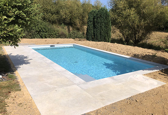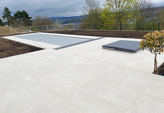 Außenterrasse mit Pooleinfassung in großformatigen Terassenfliesen, 120 x 120 cm